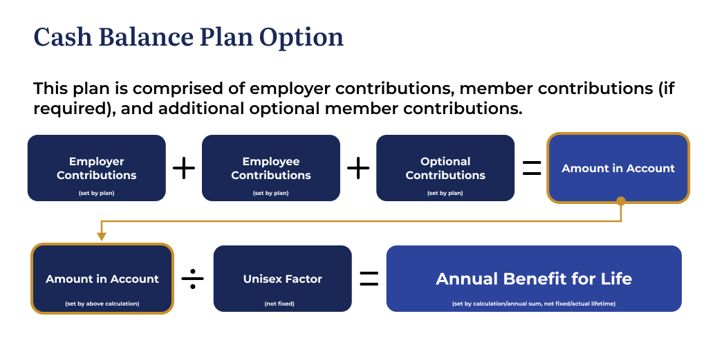 Flowchart detailing a Cash Balance Plan Option. The first row details the calculation for the Amount in Account: Employer Contributions plus Employee Contributions plus Optional Contributions equals Amount in Account. The second row shows the calculation for the Annual Benefit for Life: Amount in Account divided by a Unisex Factor equals Annual Benefit for Life.